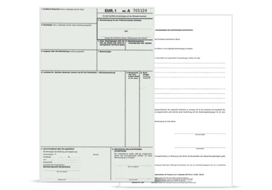 The EUR 1 certificate is a preferential document for goods that are produced inside the EU and which fulfil conditions in the various origin protocols concluded with destination countries. This preference can be important for the addressee of the goods in the country of destination for the calculation of import duty.